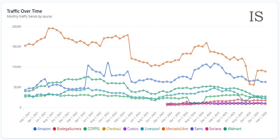 Insight Society: Los 20 principales ecommerce de México reciben poco más de 300 millones de visitas cada mes. Como sabemos, el ecommerce en México está altamente concentrado, dominado abrumadoramente por MercadoLibre y Amazon. Sin embargo, los datos de tráfico de los últimos 5 años revelan una desaceleración generalizada a partir de 2025 para los gigantes tradicionales, mientras que el formato de supermercados (liderado por Bodega Aurrera) muestra una resiliencia y crecimiento notables.