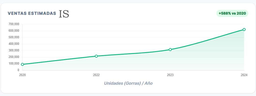 Si en 2024 vendieron más de 620,000 gorras en México y usamos un precio promedio conservador de 1,000 pesos por unidad, solo en gorras estaríamos en el orden de 620 millones de pesos en 2024, únicamente por caps.
