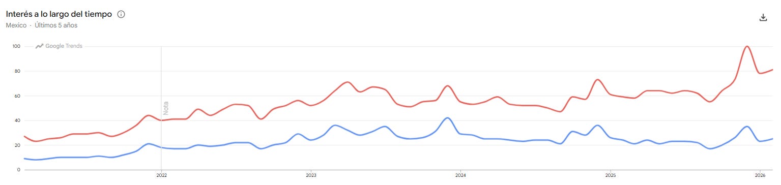 En conjunto, los datos muestran que el interés por la marca está estrechamente sincronizado con la demanda de la categoría, consolidándola por mucho como la mejor posicionada en México para esta prenda. No hay ninguna otra gorra de marca que se busque con tanta fuerza, la segunda de la lista, (gorras de Nike), se buscan 5 veces menos que las de New Era.