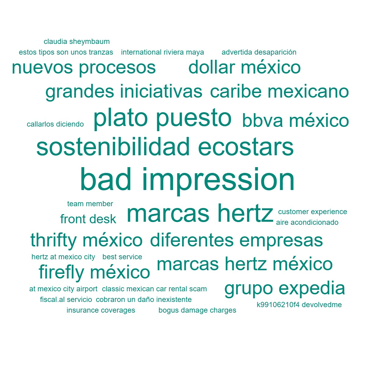 Los problemas comienzan a aflorar rápidamente cuando vemos cuántas de las menciones de los usuarios son negativas para cada una de las marcas. En el caso de Hertz, son el 20.64% (¡4 mil quejas!), Europcar 14% (841 quejas), Avis 28.2% (946 quejas), Mex Rent a Car 48.6% (1088 quejas), Thrifty 37.15% (298 quejas) y Álamo 17.3% (65 quejas).